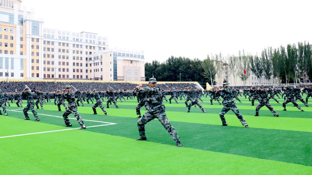 在軍訓(xùn)科目展示環(huán)節(jié),退役大學(xué)生士兵協(xié)會(huì)進(jìn)行了軍事特色項(xiàng)目表演;電子工程學(xué)院200名男同學(xué)組成的表演方隊(duì)進(jìn)行了軍訓(xùn)科目擒敵拳表演。