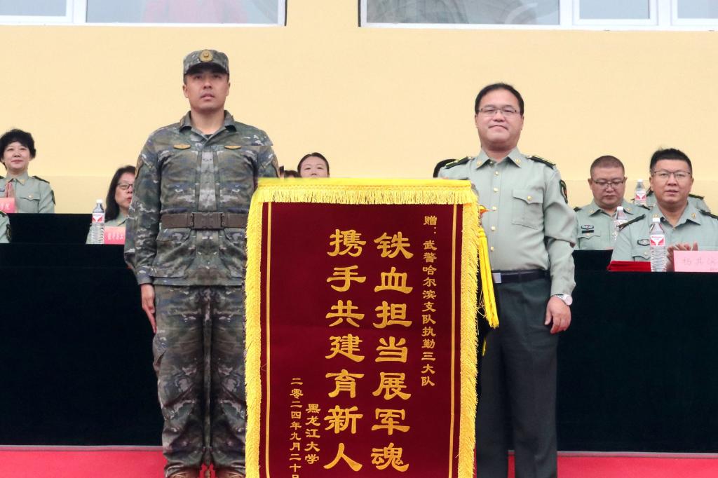 副校長(zhǎng)、軍訓(xùn)師師長(zhǎng)井立強(qiáng)代表學(xué)校向承訓(xùn)單位武警哈爾濱支隊(duì)贈(zèng)送錦旗。