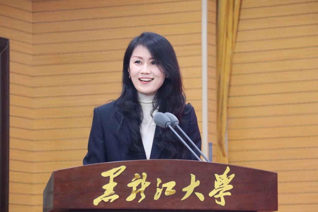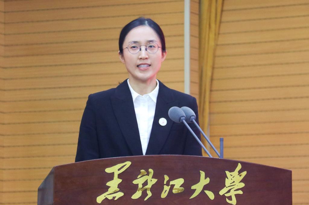 電子工程學院博士生導師秦丹陽作為教職工代表發言。她結合自身教學經歷向新教職工分享了熱愛與奉獻、師德與責任、創新與進取、合作與共贏四組詞語的含義和踐行要求。她表示,這些詞語不僅是個人教學的感悟,更是教師應當共同踐行的教育精神和信念指引。她號召全體教師懷揣熱愛,勇于擔當,不斷創新,緊密合作,共同書寫黑龍江大學更加輝煌燦爛的篇章!