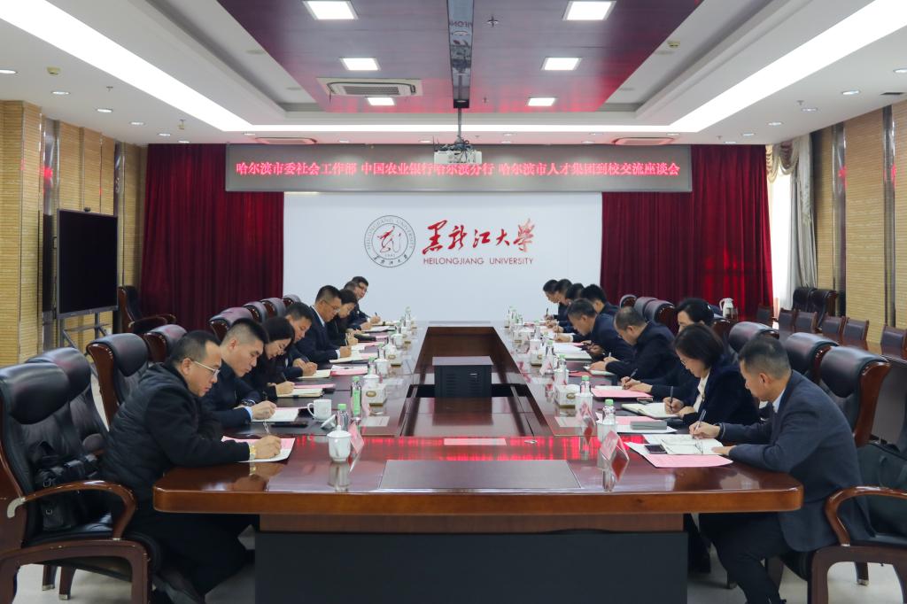 10月22日下午,哈爾濱市委社會工作部部長王世軒,省農行黨委委員、副行長兼哈爾濱市農行黨委書記、行長孟喆,創投集團董事會秘書、丁香人才發展集團董事長呂文全一行來校調研,雙方在主樓A802召開座談會。校黨委書記遲寶旭出席會議并主持,人事處、校團委、國內合作發展中心、政府管理學院、繼續教育學院、招生就業指導中心等部門負責同志參加座談。