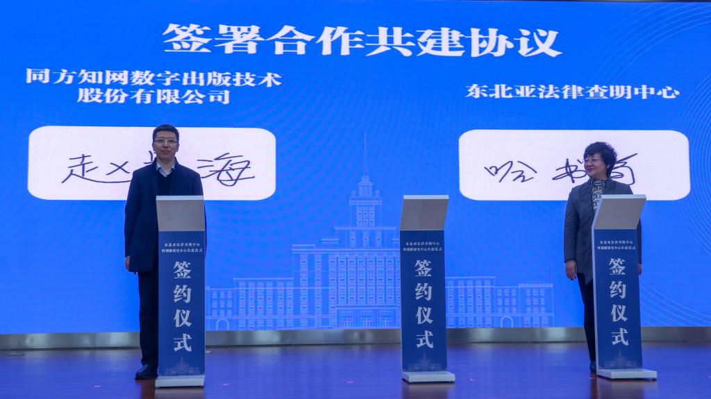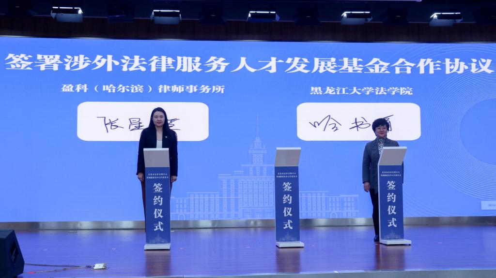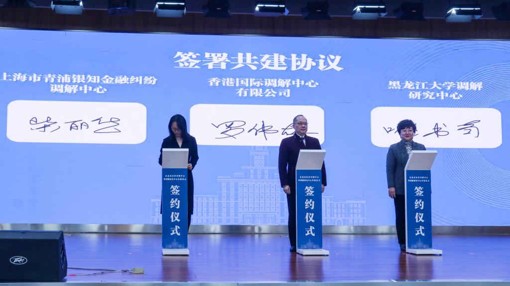 法學院院長、東北亞法律查明中心主任哈書菊代表黑龍江大學調解研究中心與香港國際調解中心有限公司、上海市青浦銀知金融糾紛調解中心簽署合作協議;哈書菊代表東北亞法律查明中心與同方知網數字出版技術股份有限公司簽署了合作協議;黑龍江大學法學院與盈科(哈爾濱)律師事務所簽署涉外法律服務人才發展基金合作協議。