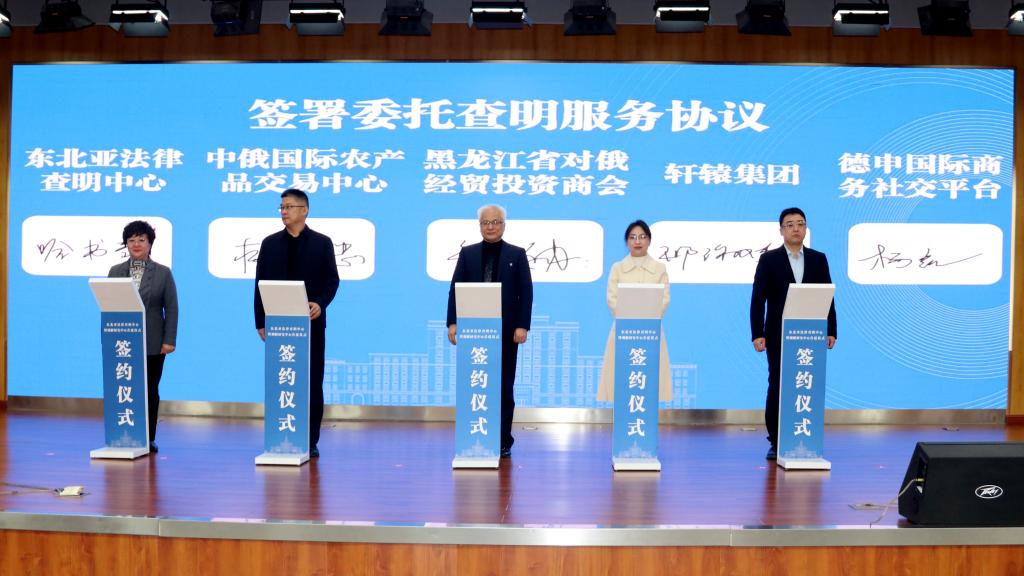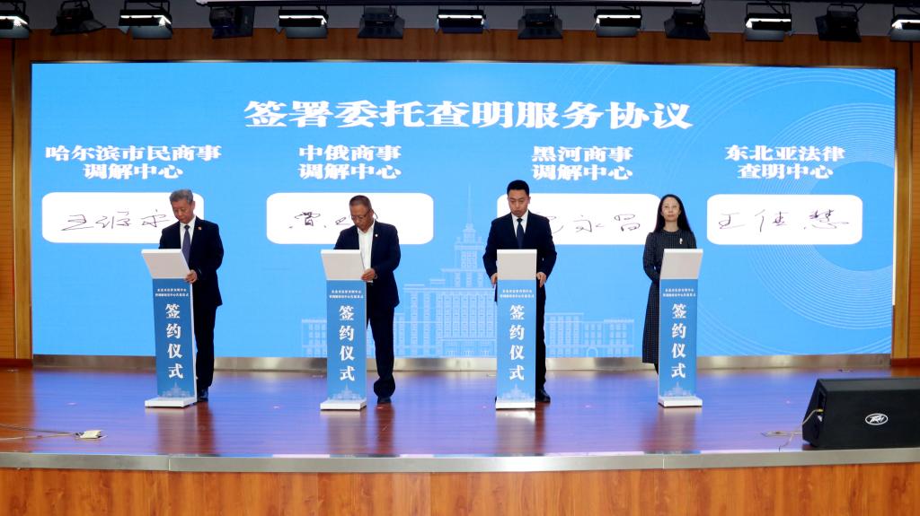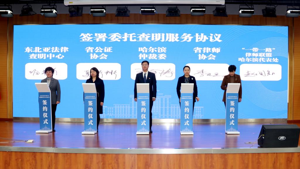 哈書菊與東北亞法律查明中心常務副主任王佳慧分別與省國資委、省公安廳、省外事辦、省工商聯、哈爾濱仲裁委員會、省律師協會、省公證協會、“一帶一路”律師聯盟哈爾濱代表處、省對俄經貿投資商會、軒轅集團、中俄國際農產品交易中心、德申國際商務社交平臺以及商事調解聯盟簽署了委托服務協議。