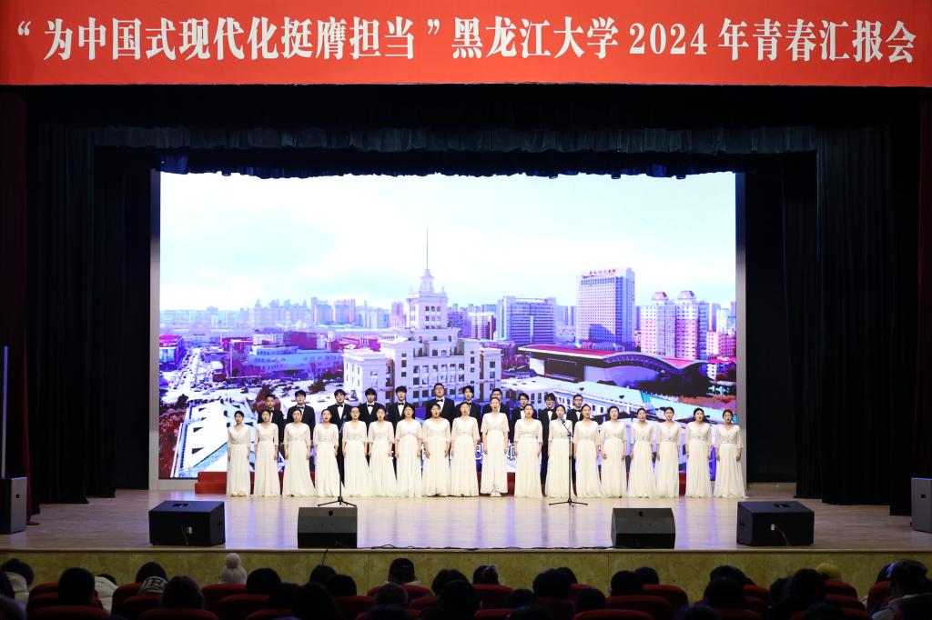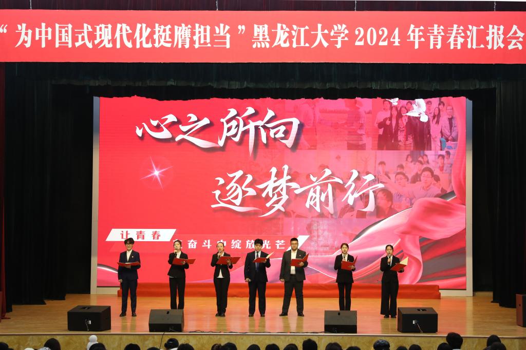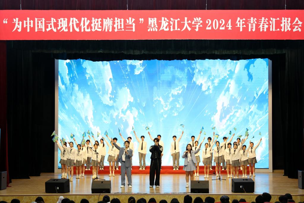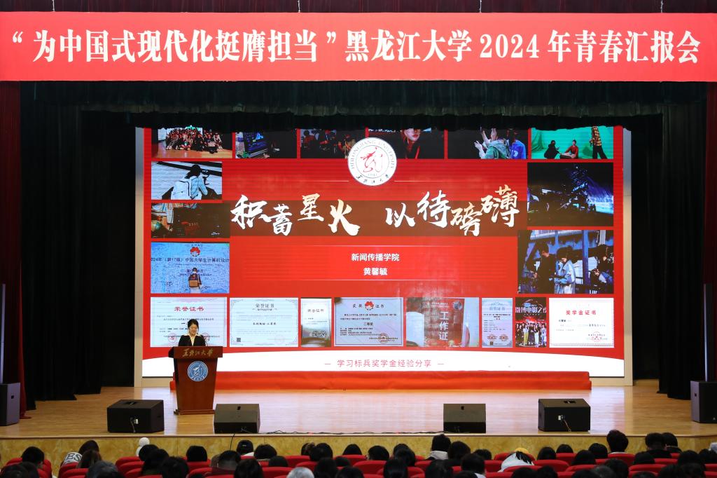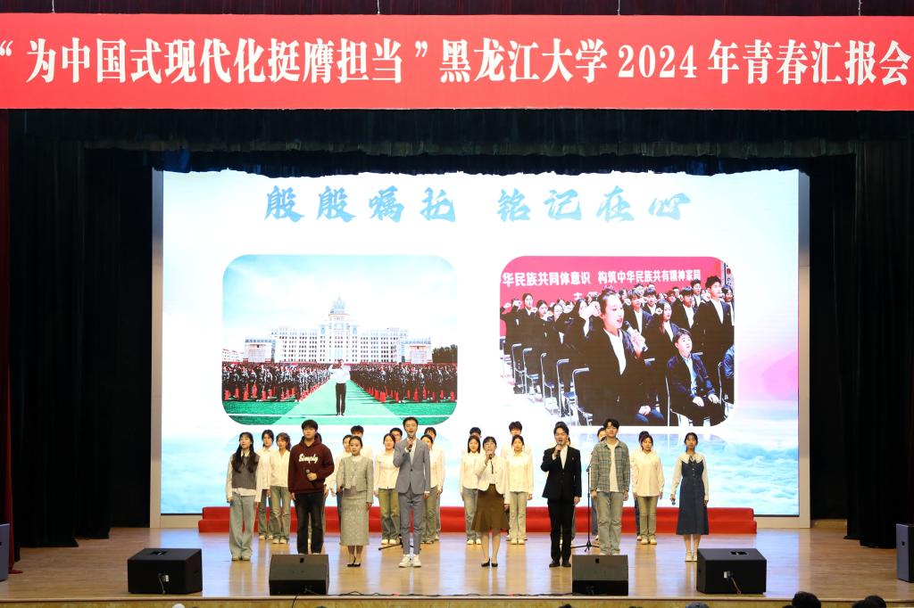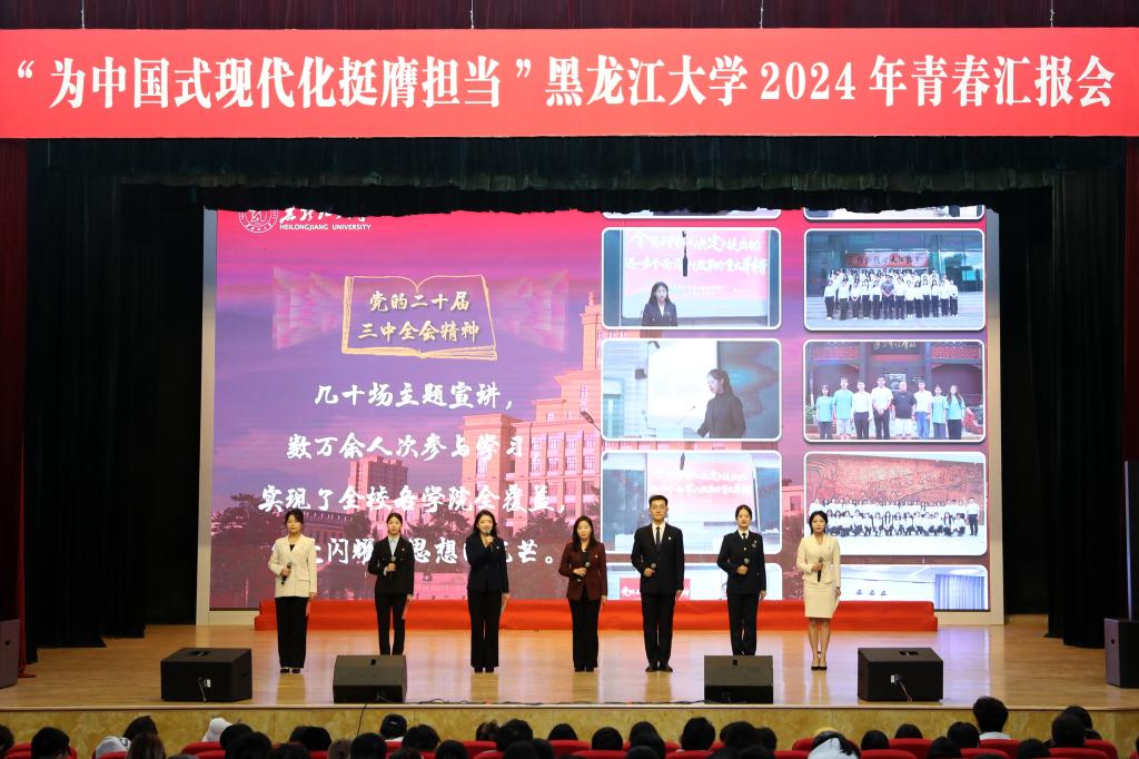 初心如磐擔使命,奮楫篤行向未來。為慶祝中華人民共和國成立75周年,深入貫徹落實黨的二十大和黨的二十屆三中全會精神,弘揚先進事跡,彰顯榜樣力量,引導黑大青年奮力書寫為中國式現代化挺膺擔當的青春篇章,12月11日下午,我校在音樂廳舉辦“為中國式現代化挺膺擔當”2024年青春匯報會。校黨委書記遲寶旭,黨委副書記劉鳳影,黨委常委、統戰部部長王培軍,黨委常委、宣傳部部長楊其濱,黨委常委、組織部部長王剛出席匯報會并為獲獎代表頒獎。