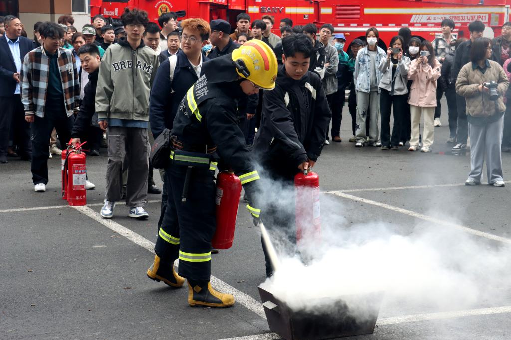 消防逃生疏散演練后,哈西消防中隊的教官向師生詳細介紹滅火器的作用及使用方法,組織師生進行實操訓練,在工作人員的指導下,同學們按照講解要求,完成“提罐、拔銷、壓柄、掃射”標準化操作。