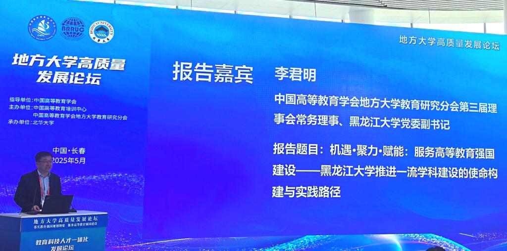 此次論壇主題為“落實(shí)教育強(qiáng)國規(guī)劃綱要,服務(wù)高等教育強(qiáng)國建設(shè)——地方大學(xué)的戰(zhàn)略選擇與實(shí)踐路徑”。李君明代表學(xué)校作題為“機(jī)遇·聚力·賦能:服務(wù)高等教育強(qiáng)國建設(shè)——黑龍江大學(xué)推進(jìn)一流學(xué)科建設(shè)的使命構(gòu)建與實(shí)踐路徑”的主旨報(bào)告。他指出,將國家戰(zhàn)略勢(shì)能轉(zhuǎn)化為高校辦學(xué)動(dòng)能,將知識(shí)溢出效應(yīng)轉(zhuǎn)化為區(qū)域發(fā)展生產(chǎn)力,將辦學(xué)傳統(tǒng)與資源轉(zhuǎn)化為學(xué)科優(yōu)勢(shì)與特色,是地方高校應(yīng)有的使命與擔(dān)當(dāng)。他分享了黑龍江大學(xué)實(shí)施四項(xiàng)辦學(xué)新戰(zhàn)略、深化一流學(xué)科內(nèi)涵建設(shè)的實(shí)踐經(jīng)驗(yàn)與探索。近年來,黑龍江大學(xué)致力于全方位構(gòu)建對(duì)俄學(xué)科體系、多維度賦能產(chǎn)業(yè)格局升級(jí)、多層次打造特色學(xué)科集群,切實(shí)以強(qiáng)校發(fā)展服務(wù)國家戰(zhàn)略,助推龍江振興。