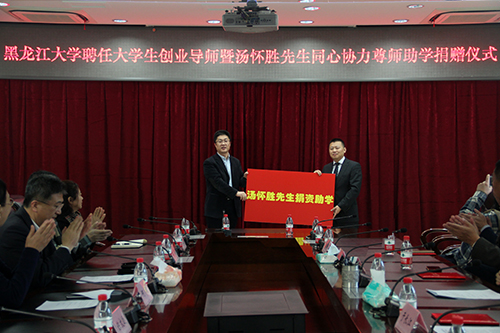 12月29日上午,黑龍江大學聘任大學生創業導師暨湯懷勝先生“同心協力,尊師助學”捐贈儀式在主樓802會議室舉行。省政協副秘書長、民進省委副主委康鳳英與省政協委員、民進省委委員、哈爾濱貴夫人皮草廣場董事長于長江,省人大代表、黑龍江中融建設集團董事長楊廣利,省政協委員、哈爾濱利興投資有限公司董事長潘慧,哈爾濱康普生物科技有限公司董事長段旭煌,哈爾濱盛杰盛醫學儀器試劑有限公司董事長湯懷勝等民進黑龍江經濟界會員聯誼會的企業家代表,我校校長何穎、工會主席陳德明,學校相關職能部處負責人、離退休老同志與創業教育學院學生代表參加了本次會議。會議由陳德明主席主持。