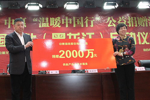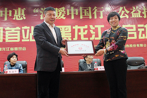 在尹會淶董事長向開明慈善基金會捐贈價值2千萬元的供熱產(chǎn)品后,寧永麗秘書長向黑龍江中惠地?zé)峁煞萦邢薰绢C發(fā)了榮譽(yù)牌。