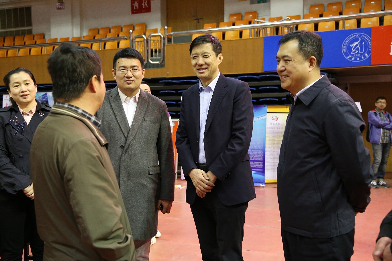 4月16日上午,由共青團(tuán)黑龍江省委員會(huì)、黑龍江大學(xué)主辦的2017年全省共青團(tuán)“千企萬(wàn)崗進(jìn)校園”省級(jí)示范活動(dòng)大型招聘會(huì)在我校體育館成功舉辦。團(tuán)省委書(shū)記李豪巖、校黨委副書(shū)記曲科軍、團(tuán)省委副巡視員李井泉在我校團(tuán)委和招生就業(yè)處負(fù)責(zé)人陪同下蒞臨招聘會(huì)現(xiàn)場(chǎng),與用人單位和求職同學(xué)親切交流。