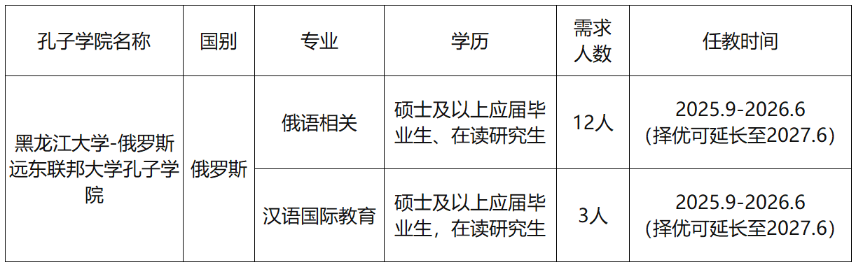 為進一步加強黑龍江大學與俄羅斯遠東聯邦大學共建孔子學院建設,提高孔子學院辦學質量和水平,促進中俄人文交流,根據遠東聯邦大學孔子學院教學工作需求,黑龍江大學現啟動2025年遠東聯邦大學孔子學院國際中文教育志愿者(以下簡稱志愿者)招募選拔工作?,F將具體事宜通知如下: