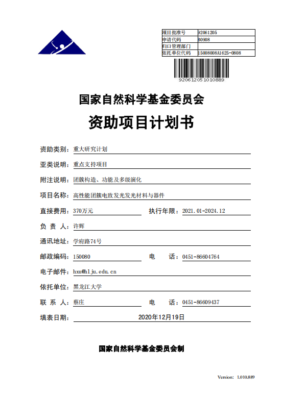 2020年,國(guó)家自然科學(xué)基金重大研究計(jì)劃,高性能團(tuán)簇電致發(fā)光材料與器件。