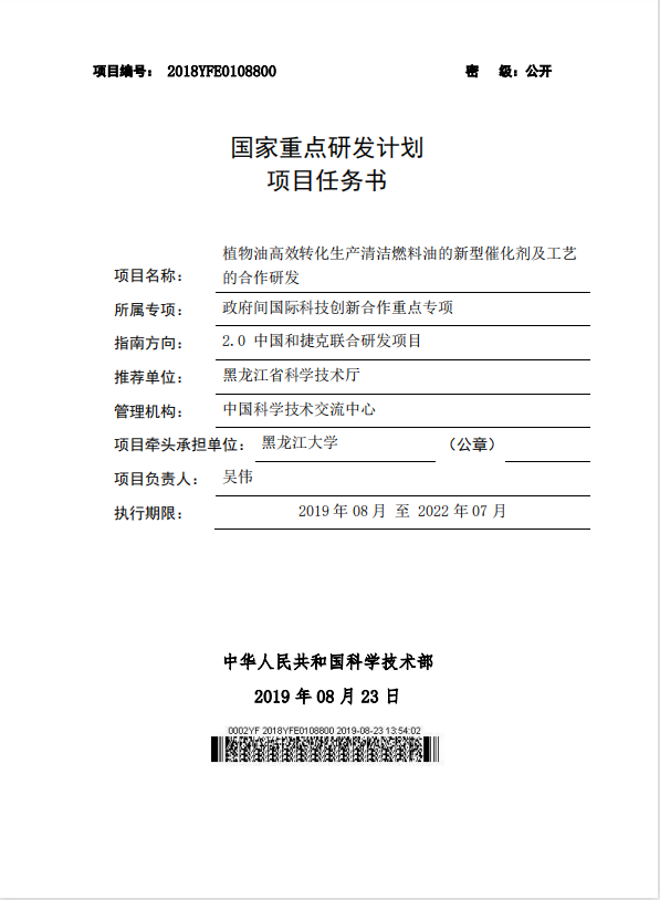 2019年,國(guó)家重點(diǎn)研發(fā)計(jì)劃中國(guó)和捷克聯(lián)合研發(fā)項(xiàng)目,植物油高效轉(zhuǎn)化生產(chǎn)清潔燃料油的新型催化劑及工藝的合作研發(fā)。
