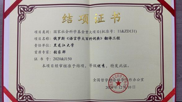 2020年9月,國(guó)家社會(huì)科學(xué)基金重大項(xiàng)目“俄羅斯《語言學(xué)大百科詞典》翻譯工程”項(xiàng)目成果鑒定會(huì)在我校舉辦。該項(xiàng)目是黑龍江省首個(gè)立項(xiàng)并結(jié)項(xiàng)的國(guó)家社會(huì)科學(xué)重大項(xiàng)目,結(jié)項(xiàng)等級(jí)為優(yōu)秀。