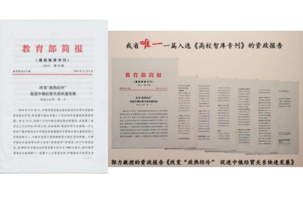 2014年11月,郭力教授的咨政報(bào)告《改變“政熱經(jīng)冷”促進(jìn)中俄經(jīng)貿(mào)關(guān)系快速發(fā)展》被教育部《高校智庫(kù)??凡杉{。