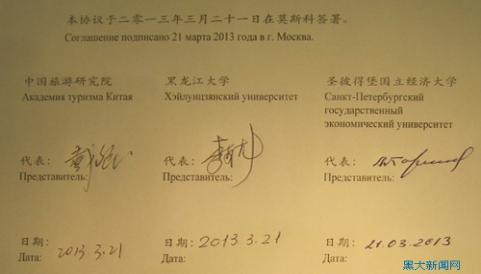 2013年3月,時(shí)任國(guó)務(wù)院副總理汪洋(后排右一)、俄羅斯聯(lián)邦副總理戈洛杰茨(后排左一)共同見證中俄全面戰(zhàn)略協(xié)作協(xié)同創(chuàng)新中心牽頭單位黑龍江大學(xué)、中國(guó)旅游研究院與圣彼得堡國(guó)立經(jīng)濟(jì)大學(xué)簽署關(guān)于旅游科研、教育與國(guó)際交流的三方合作協(xié)議。