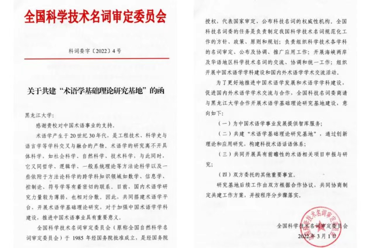 2022年3月,學(xué)校申獲“術(shù)語學(xué)基礎(chǔ)理論研究基地”(全國(guó)科學(xué)技術(shù)名詞審定委員會(huì)與黑龍江大學(xué)共建)。