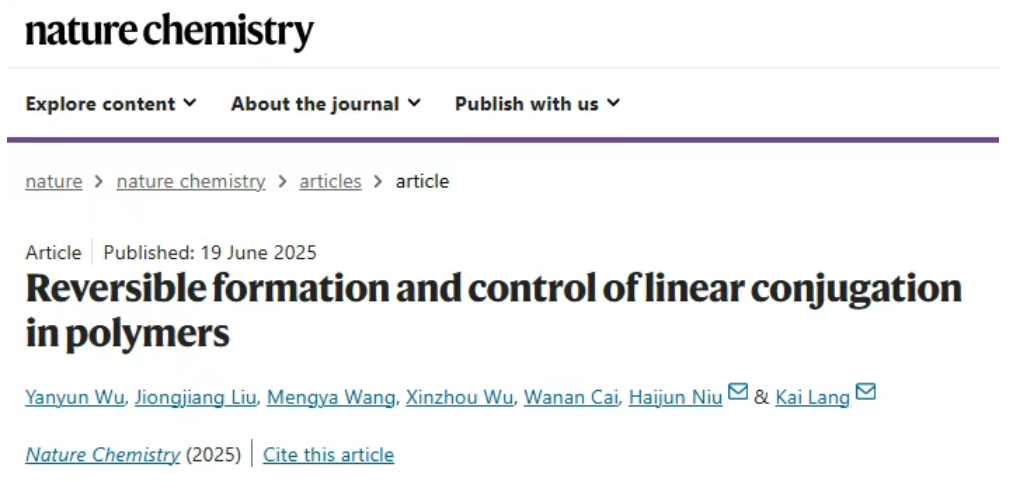 近期,我校郎凱教授和牛海軍教授所帶領的研究團隊,在Nature Chemistry上發表題為“Reversible Formation and Control of Linear Conjugation in Polymers”的研究論文。這是黑龍江省屬高校作為第一完成單位的成果首次登上《自然?化學》,是我校科學研究取得的又一次歷史性重大突破。郎凱老師作為我校從美國引進回國的優秀學者,是我校實施“人才強校戰略”的優秀代表。
