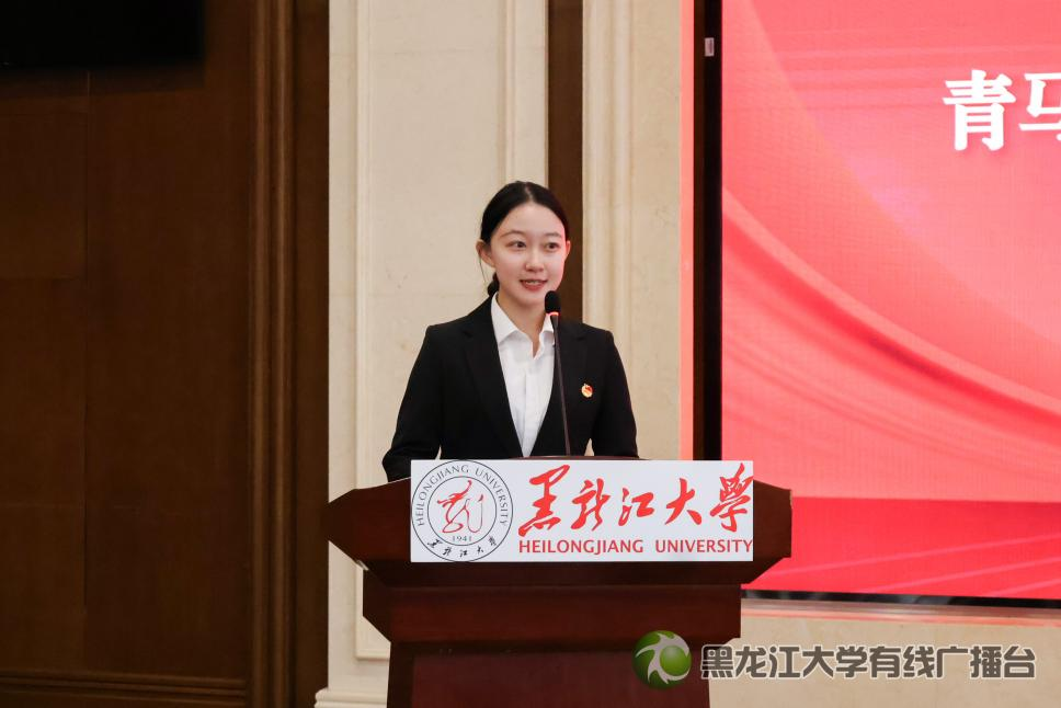 第九期“黑大菁英”大學生骨干培訓班學員代表劉宇歡發言,她回顧了一年以來的收獲與成長,感謝各位老師的辛勤培育,并將繼續堅定理想信念,在實踐中錘煉自我。黑龍江省第十七期“青馬工程”優秀學員馬銘澤發言,他鼓勵學弟學妹們以馬克思主義信仰筑牢精神根基,在時代浪潮中堅定方向、勇擔使命。第十期“黑大菁英”大學生骨干培訓班學員代表馬悅發言,她表達了對此次學習的期待,并代表學員鄭重承諾,以奮斗之姿早日成長為一名合格的青年馬克思主義者。