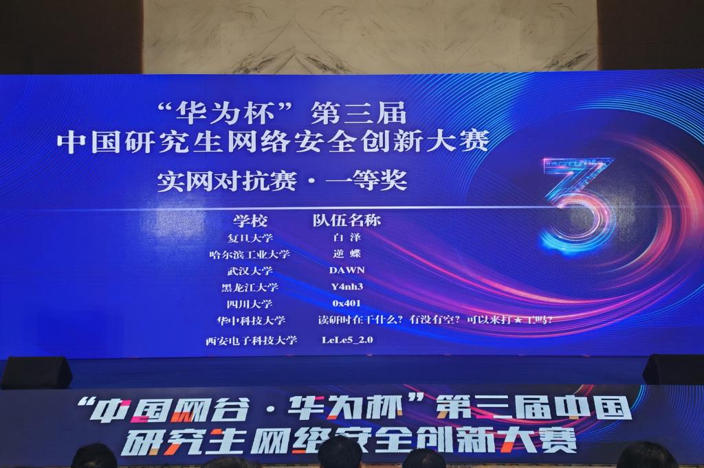 11月16日—17日,“中國(guó)網(wǎng)谷·華為杯”第三屆中國(guó)研究生網(wǎng)絡(luò)安全創(chuàng)新大賽全國(guó)總決賽在武漢國(guó)家網(wǎng)絡(luò)安全人才與創(chuàng)新基地舉行。由黑龍江大學(xué)計(jì)算機(jī)與大數(shù)據(jù)學(xué)院(網(wǎng)絡(luò)安全學(xué)院)、研究生院、創(chuàng)新創(chuàng)業(yè)教育學(xué)院聯(lián)合指導(dǎo)的“延河—Y4nh3戰(zhàn)隊(duì)”(團(tuán)隊(duì)成員:雷天葆、陳佳怡、王英哲,指導(dǎo)教師:王磊)經(jīng)過激烈角逐,以總決賽第七名的成績(jī)榮獲實(shí)網(wǎng)對(duì)抗賽一等獎(jiǎng),同時(shí),學(xué)校榮獲優(yōu)秀指導(dǎo)教師獎(jiǎng)、優(yōu)秀組織單位獎(jiǎng),刷新學(xué)校在該賽事中的歷史最好成績(jī)!
