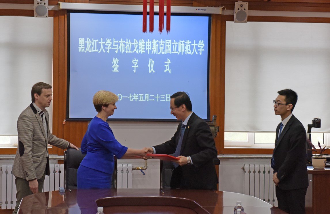 5月23日上午,我校與俄羅斯布拉格維申斯克國立師范大學合作協議補充條款簽字儀式在黑河舉行。王司瑜副校長與肖金娜·薇·維校長分別代表各自學校在協議上簽字。補充協議規定,兩校將進一步加強在黑龍江流域歷史文化研究及聯合考古發掘等方面的合作。歷史文化旅游學院段光達院長、王樂文副院長出席了簽字儀式。