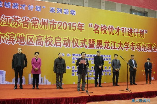 12月24日上午,常州市2015年“名校優才引進計劃”哈爾濱地區高校啟動儀式暨黑龍江大學專場招聘會在我校體育館舉行,拉開了常州市在哈爾濱大規模引進2015屆優秀高校畢業生的序幕。黑龍江省教育廳學生信息咨詢與就業指導中心副主任郭承哲,我校黨委副書記曲科軍,中共常州市委組織部副部長、市編辦主任楊琪,常州市鐘樓區人民政府副區長張菁,常州市人力資源和社會保障局副局長程沫芝出席了本次啟動儀式。