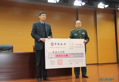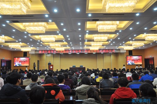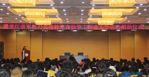 11月5日下午,黑龍江省軍區(qū)“萬名將校軍官助學(xué)工程進(jìn)大學(xué)”活動捐助儀式在我校主樓一樓報告廳舉行,省軍區(qū)募集善款20萬元資助來自黑龍江大學(xué)、哈爾濱工程大學(xué)的100名寒門學(xué)子。