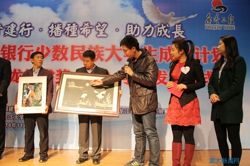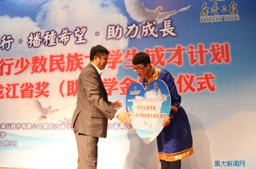 建行黑龍江省分行辦公室主任武連成為2014年獲獎少數(shù)民族大學(xué)生代表頒發(fā)獎(助)學(xué)金。這標(biāo)志著“中國建行少數(shù)民族大學(xué)生成才計劃”黑龍江省的最后一筆獎學(xué)金發(fā)放完畢。