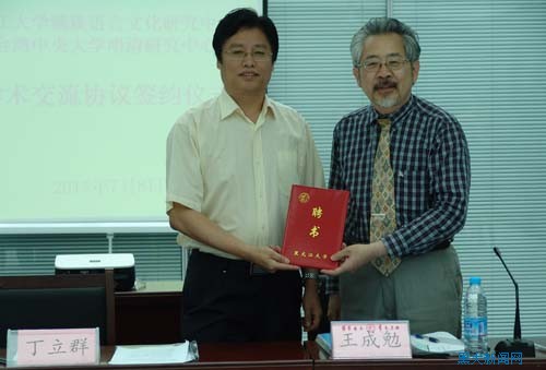 在研討會開幕式上,黑龍江大學(xué)滿族語言文化研究中心與臺灣中央大學(xué)明清研究中心簽署了學(xué)術(shù)交流協(xié)議。丁立群副校長代表學(xué)校向王成勉教授頒發(fā)黑龍江大學(xué)滿族語言文化研究中心榮譽教授聘書,并表示,希望通過學(xué)術(shù)交流協(xié)議的簽署,深入推動兩校、兩中心在學(xué)科建設(shè)、學(xué)術(shù)交流、人才培養(yǎng)、社會服務(wù)等領(lǐng)域的密切合作。