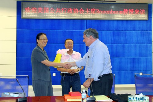 羅森鮑姆教授向黑龍江大學的盛情邀請表示感謝,同時他也希望以此行為契機,與黑大的學者、師生相互學習,分享經驗,在相關學術領域的探索和創新中共同進步。隨后的發言里,羅森鮑姆教授從世界公共行政領域的現狀和未來發展趨勢出發,分別談了該學科在世界不同地區的不同研究進展、多元化理論范疇、更廣泛的多種新方法論途徑、學科國際化以及應進一步關注少數民族、性別、種族的多樣性,積極應對全球視野下的新的政策領域和國際認可活動的出現等觀點。