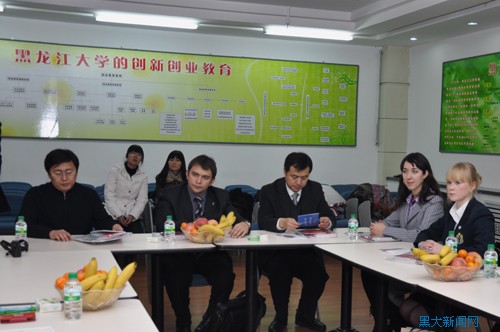 12月21日上午9時許,俄羅斯遠東地區青年議會代表團一行來我校參觀。代表團成員有阿穆爾州青年議會主席伊萬諾夫?維亞切斯拉夫?尼古拉耶維奇,哈巴洛夫斯克邊疆區青年議會主席卡夫沙爾?奧列沃波拉?列沃尼托夫娜,布拉戈維申斯克市師范大學國際系討論俱樂部主任沃洛尼娜?巴塔麗雅?阿納托里耶夫娜,阿穆爾州青年議會成員佛羅連科?娜塔利亞?瓦連金諾夫娜。共青團黑龍江省委副書記、黑龍江省青聯主席李豪巖,共青團黑龍江省委聯絡部部長、黑龍江省青聯秘書長劉冰陪同參觀。校黨委副書記關健同俄語學院黨委書記孫勇、副院長賈旭杰,創業教育學院院長吳金秋,團委副書記吳珩等共同會見了代表團一行。