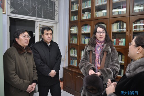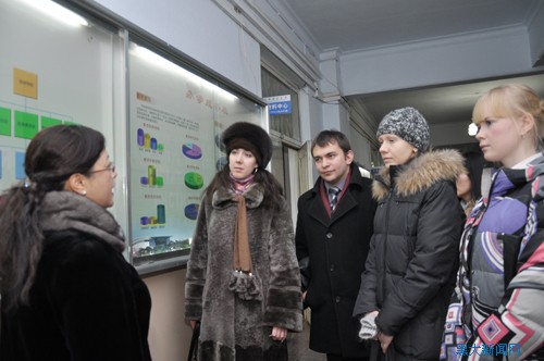 隨后,代表團參觀了我校俄語學院。賈旭杰副院長從教學團隊、教學機構,對俄合作、互訪交流等各方面向外國友人介紹了俄語學院的辦學成果,并帶領代表團參觀了俄語學院院史展室、學術活動中心和俄國語言文學資料中心。在俄語同聲傳譯訓練中心,賈旭杰老師向代表團一行介紹了我校的俄語同聲傳譯教學工作。