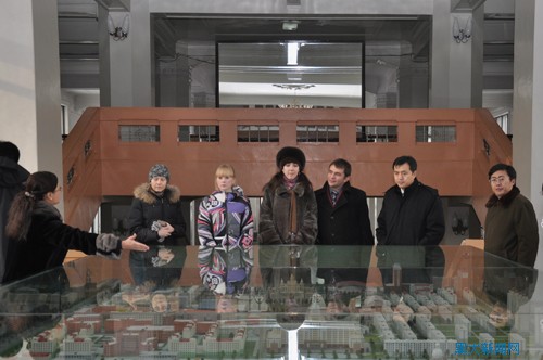 代表團一行首先在主樓大廳參觀了學校沙盤模型,賈旭杰副院長向代表團成員詳細介紹了我校的整體狀況及各功能分區。