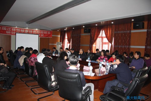 11月10日,由我校承辦的“全國遷移性蝗害綠色防控技術研討及中期總結(jié)”學術研討會在留學生公寓會議廳舉行。包括農(nóng)業(yè)部全國農(nóng)技推廣中心病蟲害防治處處長楊普云,中國農(nóng)業(yè)大學科技處處長段留生,全國遷移性蝗害綠色防控技術項目首席專家張龍、黑龍江省植檢植保站站長陳繼光、我校副校長閆鵬飛在內(nèi)的全國40余位專家、學者及項目參加單位負責人出席了會議。
