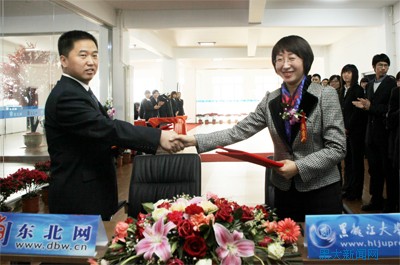 東北網絡臺總編輯丁國懷與黑龍江大學出版社社長李小娟簽訂合作協議