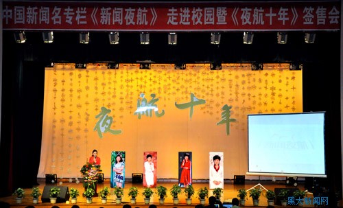 12月12日下午,中國新聞名欄目《新聞夜航》走進校園暨《夜航十年》簽售會在黑龍江大學音樂廳隆重舉行。黑龍江大學出版社社長李小娟、新聞傳播學院院長鄭亞楠、黑龍江省電視臺《都市頻道》總監楊河山、《新聞夜航》制片人張曉梅等出席了此次簽售會。《交鋒》欄目制片人武一鶴、《新聞夜航》欄目主播朱丹、李莉、修琳、于碩以及欄目組其他成員也出席了此次簽售會并在會上作精彩演講。
