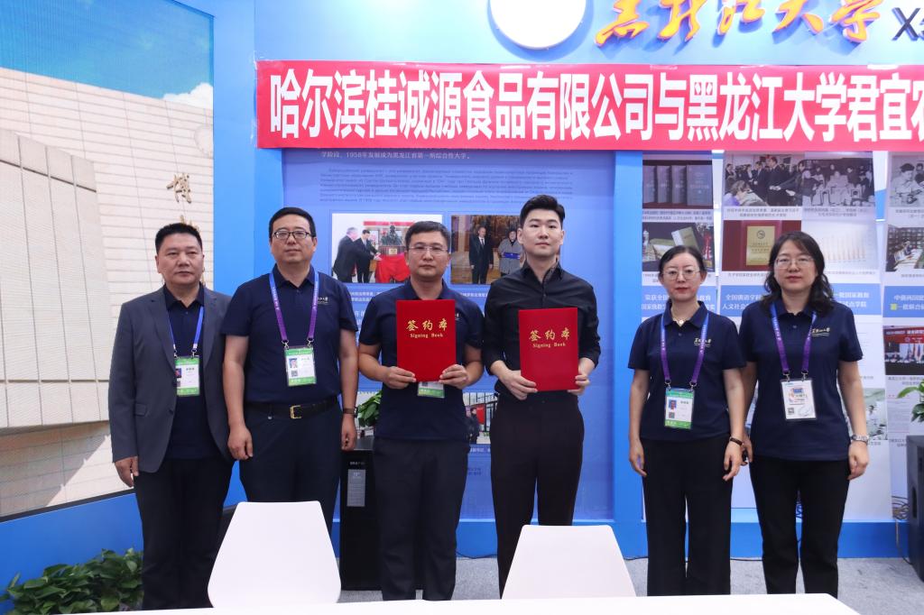 展會期間舉行了黑龍江君宜農業有限責任公司與哈爾濱桂誠源食品有限公司合作簽約儀式。簽約產品“馮教授”酸黃瓜是黑龍江大學完全擁有自主知識產權的農業食品,產品緊緊圍繞黑龍江省“4567”現代化產業體系,以“農頭工尾”為導向,在實現科研成果轉化的同時以訂單農業帶動鄉村振興。