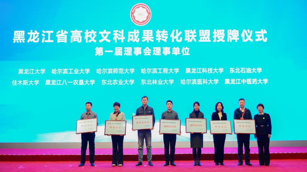 潘俊霞、王敬波、王躍然、李林及7家聯(lián)盟理事單位相關(guān)負(fù)責(zé)人共同啟動(dòng)“黑龍江省高校文科成果轉(zhuǎn)化聯(lián)盟”。